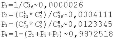 Расчитаем вероятность угадываения 5-и, 4-х и 3-х номеров.