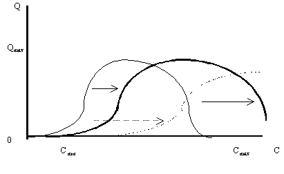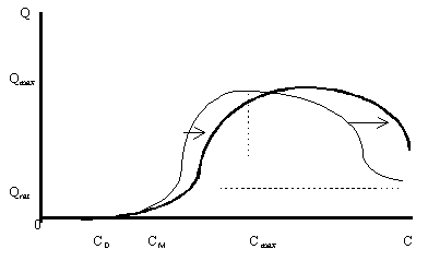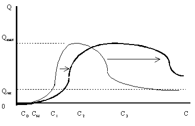 Для этого вновь воспользуюсь полученными ранее рисунками, в частности, рисунком, на котором была изображена проекция равновесной кривой на плоскость объем-доход товара, не являющегося предметом повседневного спроса. На рисунке 3 изображена эта проекция тонкой линией. Толстой линией на рисунке изображена проекция кривой после исчисления у потребителя налога.