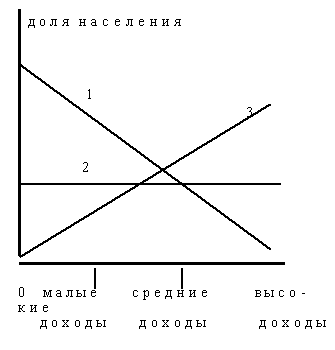 Теперь самое время рассмотреть взаимосвязь между эффективным налогообложением доходов граждан и уровнем развития страны. Для этого предлагается следующая классификация. Население любой страны состоит из людей с малыми доходами, средними доходами и большими доходами. Уровень развития страны характеризуется тем, сколько в стране людей с малыми, средними и большими доходами. На рисунке 5 изображен условный график уровня развития страны на плоскости, одной из осей которой является доход, а другой осью - доля населения. На плоскости, определяемой этими осями, изображены три условные линии.