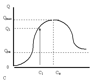 Рисунок 1.1. Кривая зависимости объема потребления Q от величины дохода С при фиксированной цене