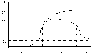 Для страны с низким уровнем развития (или исторически - на начальной стадии капитализма) значительная часть потребления сосредоточена на первом участке и с увеличением дохода потребителя растет и его желание потреблять все большее и большее количество товара. Капиталисты, реагируя на все возрастающий спрос, расширяют производство. В подавляющем большинстве случаев между моментом производства и моментом потребления существует временной лаг. Кроме того, само производство в значительной части случаев достаточно инерционно. Капиталист, прогнозируя тенденцию потребления выпускаемого им товара, рассчитывает на дальнейший рост объемов потребления и завышает в расчетах объемы потребности (жирная пунктирная линия на рисунке 2.1). Когда потребитель, доход которого вырос и достиг величины С1, намерен совершить покупку товара при данной цене, он желает приобрести товар лишь в объеме Q1 единиц. На рынок же предложено (в соответствии с прогнозом объема потребления) большее количество товара, а именно - Q'1 единиц. Образовался излишек, который и является причиной возникновения в обществе кризиса перепроизводства.