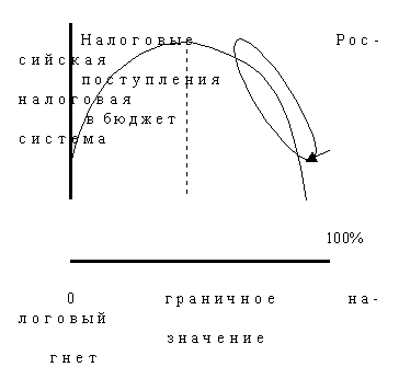 Любой грамотный экономист в состоянии показать графически (рисунок 1), что прямая пропорциональная зависимость между налоговым гнетом и объемом поступлений в бюджет существует только при незначительных налоговых ставках. При увеличении налогового гнета данная зависимость становится нелинейной и объем прироста поступлений от налогов в бюджет уменьшается с его увеличением. При достижении некоторого значения, которое принято называть граничным, дальнейшее увеличение налогового гнета приводит к уменьшению налоговых поступлений в казну. Зависимость становится обратно пропорциональной. Естественно, что в этом случае дальнейшее увеличение налоговых ставок приведет к ухудшению сбора налогов.