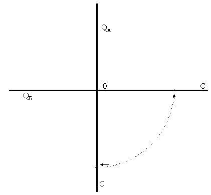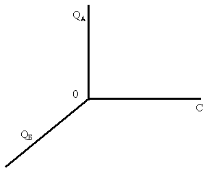 С учетом того, что каждой точке на оси дохода соответствует (в общем случае) единственное значение величины объема товара А и единственное значение величины объема товара Б, то по этим точкам теоретически можно построить искомую пространственную кривую совместного распределения объемов двух товаров в зависимости от дохода покупателя. Построение подобной кривой в трехмерном пространстве возможно, но ее трехмерное изображение на плоскости все же достаточно трудоемко. В то же время это изображение, которое с большим трудом удастся построить, не имеет особого смысла, так как исследователя не столько интересует местонахождение этой кривой в данном пространстве, сколько ее проекции на плоскость объем QА- объем QБ (как это делается в классической теории).