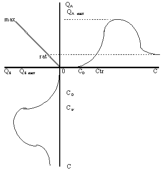 Описанный эпюр представлен на графике рисунка 4. На нем пунктиром показано построение наиболее характерных точек проекции кривой на плоскость объемов. Точка, обозначенная словом "max" характеризует максимальные значения объемов. Первоначальный участок кривой находится между нулевой точкой (начало координат) и этой точкой. С дальнейшим увеличением дохода проекция кривой на плоскость объемов будет представлена отрезком от точки "max" до точки "rat", которая характеризует рациональный объем потребления.