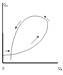 В результате получена очень красивой формы петля совместного распределения объемов двух товаров, которая, как видно из рассуждений, предваряющих ее построение, вовсе не является чем-то невероятным. Более того, появление таких петель в экономической практике следует считать вполне заурядным явлением.