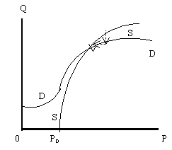 Следующий, четвертый участок имеет кривые спроса и предложения, отличающиеся от известной классической постановки (рисунок 5). Касательная к каждой точке рассматриваемого участка равновесной кривой имеет положительный наклон, то есть первая производная на этом участке положительна. При этом и кривая равновесия и кривая спроса имеют наклон в одинаковом направлении. Тем не менее их пересечение дает достаточно устойчивую точку равновесия, но это равновесие характеризуется тем, что незначительное изменение цен приводит к более значительному изменению объемов. То есть эластичность объемов по цене оказывается вновь больше единицы.