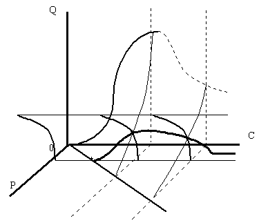 Необычность поведения кривой равновесия обнаруживается уже на первой проекции, а именно на рисунке 5. Дело в том, что кривая равновесия представляет собой в данном случае уже сложную фигуру, а не кривую в строгом математическом смысле - одному значению фактора соответствует два значения аргумента и наоборот. До точки перелома, которая обозначена на рисунке 5, равновесная кривая ведет себя нормальным образом, однако при достижении поверхностью предложения линии максимальных объемов и совпадении с ней кривая раздваивается и превращается уже в фигуру, а не кривую.
