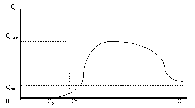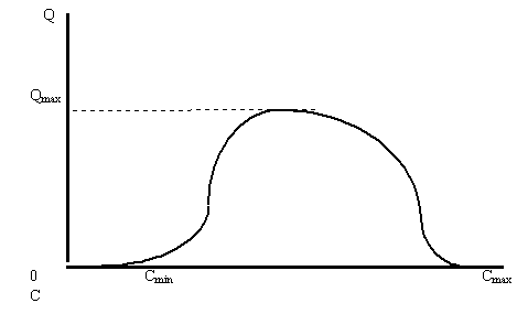 На ось доходов рисунка нанесены два граничные значения дохода - Сmin и Cmax. Первое значение характеризует тот доход, при котором потребитель уже имеет возможность приобретать данный товар в малых ненулевых количествах. Второе значение характеризует тот доход, при котором интересы покупателя полностью переключаются на другой товар.