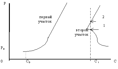 Из этого следует, что первый участок характеризуется диктатом со стороны производителя товара, второй - диктатом со стороны потребителя. Иначе говоря, первый участок характерен для монополизма производителя, второй - для конкуренции и борьбы производителя за покупателя.