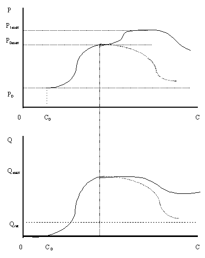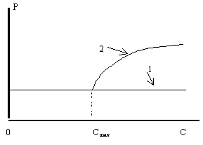 На графике показаны две линии. Первая линия характеризует тот след поверхности предложения, который присущ предложению, не зависящему от дохода. Поэтому эта линия имеет вид прямой, проходящей параллельно оси доходов. Вторая линия представляет поведение предложения, при котором учитывается доход потребителей. В начальной части этой линии она практически совпадает с первой проекцией. Это происходит до тех пор, пока доходы потребителей не достигнут величины максимального потребления данного товара (на рисунке этот доход обозначен Cmax). Для потребителей с большими доходами объемы приобретения этого товара уменьшаются. Для того, чтобы удержать на достигнутом максимальном уровне объемы потребления, производителю необходимо улучшить потребительские свойства товара. Одним из направлений этой работы может быть повышение качества товара.