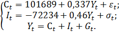 в первом уравнении означает, что при увеличении ВВП на 1млрд. $ потребление возрастает в среднем на 337 млн. $. Коэффициент 0,46 при