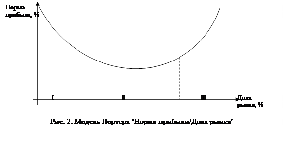 · Доля рынка, занимаемая предприятием . Влияние данного фактора можно рассмотреть на примере модели Портера «Норма прибыли/Доля рынка» (рис. 2 приложения). В случае I если фирма занимает небольшую долю рынка, то ей лучше выбрать концентрированный тип маркетинга и использовать стратегию рыночной ниши. При этом, удовлетворяя особые требования узкого сегмента рынка, предприятие имеет возможность назначать более высокие цены и иметь большую норму прибыли. В случае II по мере наращивания объемов производства снижаются средние издержки и у фирмы появляются резервы для снижения цены и увеличения занимаемой фирмой доли рынка. Фирма выбирает недифференцированный тип маркетинга, что соответствует стратегии лидерства по низким издержкам. Однако в этом случае фирма должна предлагать рынку недифференцированный товар, который должен пользоваться массовым спросом, при этом норма прибыли будет не высокой. В случае III если фирма занимает значительную долю рынка и имеет возможность предложить каждому сегменту свою особую модификацию товара, то это означает, что она использует товарно-дифференцированный тип маркетинга, что соответствует стратегии дифференциации. При этом фирма имеет большие обороты и на каждом сегменте получает высокую норму прибыли;