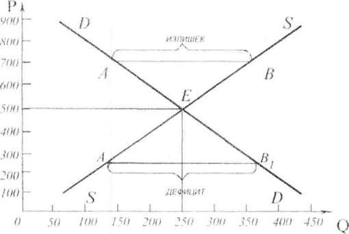 При повышении цены спрос падает, а предложение растет. БЭ — кривая спроса; 88 - кривая предложения. При наложении кривой спроса на кривую предложения можно определить рыночное равновесие, которое происходит в точке Е при пересечении кривых ББ и 88. Цена в точке Е называется равновесной, В этой точке между спросом и предложением устанавливается рыночное равновесие. При цене 250 возникнет дефицит в размере А1В1 при цене 700 — излишек АВ. Отсюда следует, что при свободной конкуренции рыночный механизм с помощью колебаний цен и изменения количества предлагаемого товара устанавливает соответствие между спросом и предложением, рынок становится равновесным.