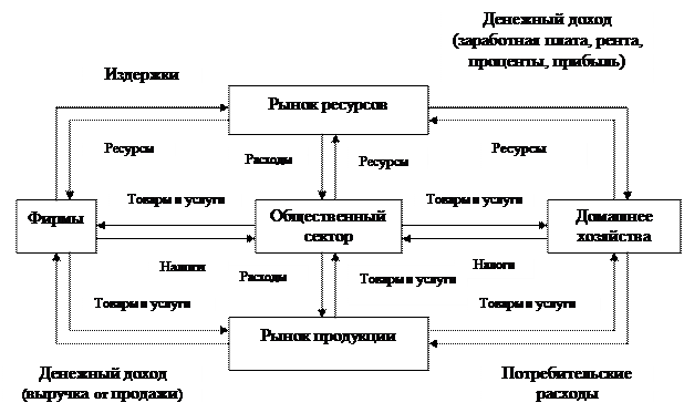 В отличие от рыночного общественный сектор имеет дело с общественными благами, которые в большинстве своем не могут являться предметом купли и продажи. В общественном секторе осуществляется производство экономических благ особого рода — общественных благ. Между рыночным и общественным секторами экономики, между государством и экономическими агентами возникают обмен деятельностью и потоки экономических благ. Общественный сектор играет активную роль в кругообороте доходов, ресурсов, товаров и услуг.