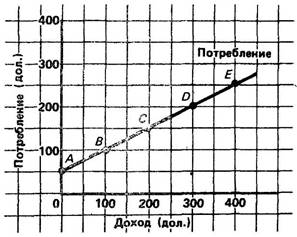 Далее необходимо поместить каждую величину потребления и каждую величину дохода, от которой она зависит, на единственной точке, графически отражающей указанную выше информацию. Наши пять комбинаций "доход — потребление" наносятся на график путем проведения перпендикуляров от соответствующих точек на вертикальной и горизонтальной осях. Например, для нахождения точки С (200 дол. дохода — 150 дол. потребления) следует провести перпендикуляры от горизонтальной оси (доход) от 200 дол. и перпендикулярной оси от 150 дол. Эти перпендикуляры пересекутся в точке С, которая и образует конкретное сочетание "доход — потребление". Вам следует удостовериться в том, что все остальные комбинации "доход — потребление", приведенные в таблице 1, правильно помещены на рисунке 1. Приняв допущение, что такое же общее соотношение между доходом и потреблением распространяется и на все другие точки между пятью нанесенными на графике, можно начертить линию, или кривую, соединяющую эти точки.