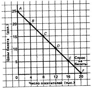 | Что показывает нам этот наклон в —5/+4, или —1 1/4? Он подразумевает, что снижение цены билета на 5 дол. увеличивает число посетителей на 4 тыс. |