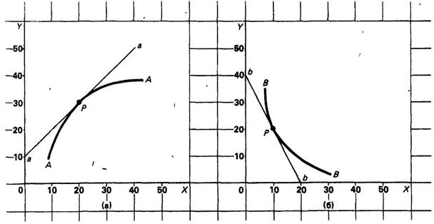 Наклон кривой изменяется по мере продвижения по ней от одной точки к другой. Наклон в любой точке можно определить проведением прямой, касающейся кривой в соответствующей точке, и измерением наклона этой прямой.