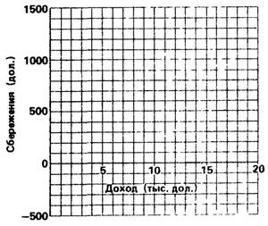 Перестройте порядок расположения этих данных, приведите его в надлежащий вид и нанесите эти данные на помещенную здесь сетку. Каким окажется наклон линии? Где будет вертикальное пересечение? Объясните значение наклона и точки пересечения. Постройте уравнение, которое соответствует линии на вашем графике. Каким, по-вашему, будет объем сбережения при уровне дохода в 12 500 дол.?