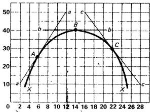 6. Помещаемый ниже график показывает кривую XX и три тангенса в точках A , B и C . Вычислите наклон кривой в этих точках.