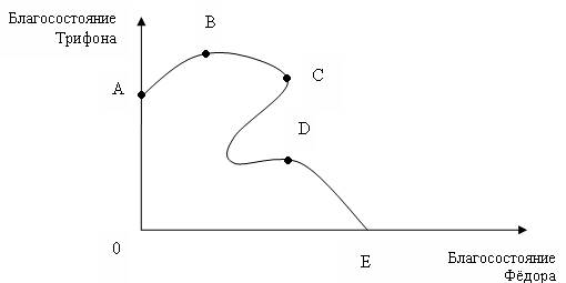 Очевидная проблема заключается в выборе подходов к оценке благосостояния индивидов. В наиболее общем виде благосостояние индивида можно определить как субъективную оценку его положения, причём эта оценка может быть дана разными членами общества, включая самого индивида, а также государственными или общественными организациями. Если мы предположим, что каждый индивид – лучший судья своего благосостояния и стремится это благосостояние максимизировать, можно использовать функцию полезности индивида как порядковый индикатор его благосостояния. Предположим, что воображаемая экономика состоит только из двух индивидуумов: Фёдора и Трифона. Если по горизонтальной оси откладывать благосостояние Фёдора, а по вертикальной – Трифона, то можно построить линию «границы ограниченных возможностей».