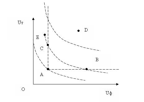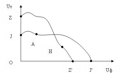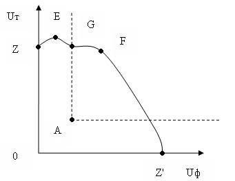 Рассмотрим движение из точки F. Посмотрим, что случится, если Фёдор уступает какую-то часть своего богатства, передавая его Трифону. Мы окажемся в точке G. В этой точке положение Фёдора хуже, а положение Трифона – лучше, чем в точке F. Двигаясь дальше, мы окажемся в точке Eи т.д. Значит, ZZ' есть геометрическое место точек всех сочетаний уровней полезностей для двух индивидуумов, которые могут быть получены через перераспределение богатства между ними и где это перераспределение не сопровождается никакими иными изменениями.