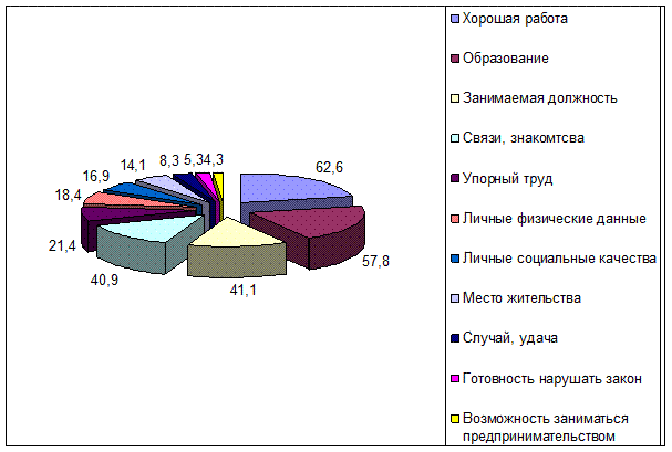 Два первых места в рейтинге факторов, наиболее важных для достижения материального благополучия, по мнению респондентов, занимают хорошая работа и образование, третье и четвёртое места – занимаемая должность, связи и знакомства. Далее в некотором отрыве названы: упорный труд, личные физические данные (здоровье, привлекательность, пол и т.д.), личные социальные качества (честолюбие, стремление к достижениям, моральные качества и другие), место жительства. Менее 18% опрошенных считают наиболее важными такие факторы, как случай или удача (8,3%), готовность нарушать закон (5,3%) и возможность заняться предпринимательством (4,3%).