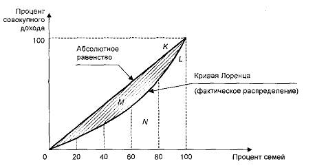 Кривая Лоренца абсолютного равенства, т.е. совершенно равномерного распределения доходов, принимает форму прямой линии в случае, когда первая группа, например, первые двадцать процентов населения, получают ровно двадцать процентов всех доходов, сорок процентов населения, соответственно, сорок процентов всех доходов и т.д. Чем больше кривая Лоренца, построенная по данным распределения доходов в той или иной стране, отклоняется от линии равномерного распределения доходов, тем сильнее в этой стране неравенство в распределении доходов между различными группами населения.