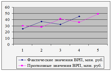 Построим график (график 2) демонстрирующий значения фактические и прогнозные по данным таблицы 7.6 (по второму и пятому столбцам).