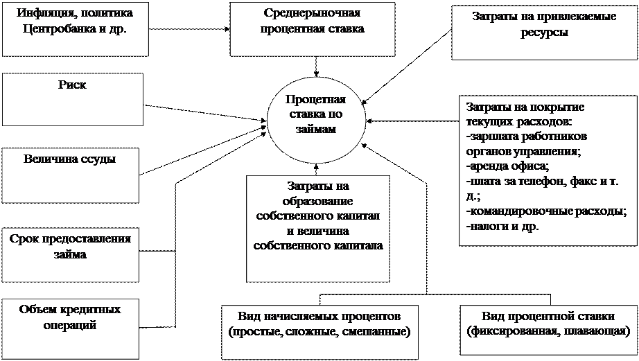 Процентные ставки по займам основываются на среднерыночных, а также учитывают затраты на управление и формирование неделимых фондов, затраты по привлечению ресурсов (выплаты процентов вкладчикам). Кроме того, процентная ставка должна учитывать уровень инфляции. Факторы, определяющие величину процентной ставки по займам, показаны на рисунке 2.