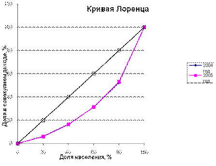 Кривая Лоренца иллюстрирует сохранение неравномерности в распределении общего объема денежных доходов в 2005 году по сравнению с 2004. Так, например, наиболее обеспеченная группа населения сконцентрировала в 2005 году 47% доходов против 47,6% в 2004 г.