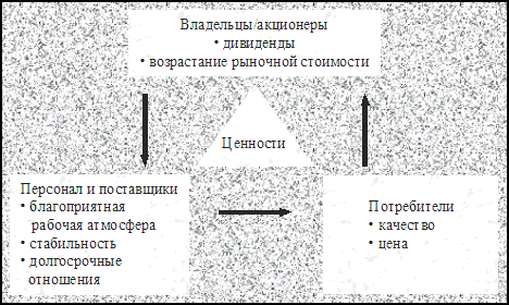 Процветающее предприятие - это предприятие, получающее устойчивую прибыль от своей деятельности. Эта задача-максимум может быть реализована на стабильной основе только через осознание и наиболее полное удовлетворение общественных потребностей или, согласно получившей широкое распространение в международной теории и практике бизнеса концепций, через создание системы ценностей для трех общественных групп: владельцев (акционеров) предприятия, потребителей его продукции, поставщиков и персонала предприятия. Владельцы (акционеры) предприятия, заинтересованы в постоянном и все более возрастающем потоке доходов и таком использовании собственных и привлеченных средств, которое увеличивает ценность принадлежащей им собственности. Персонал и поставщики заинтересованы в стабильности предприятия, в развитии с ним долгосрочных отношений, в благоприятной рабочей атмосфере. Для потребителей наивысшую ценность представляют товары и услуги, удовлетворяющие их по качеству и цене (рис.1).