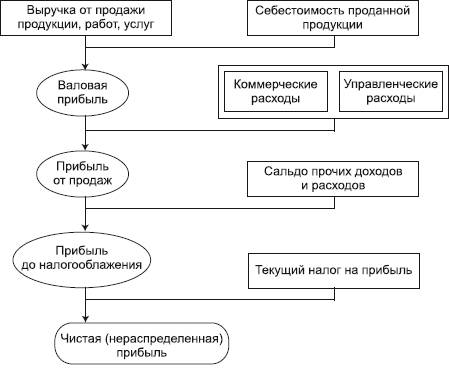 Финансовые результаты хозяйственной деятельности коммерческой организации определяют на счетах бухгалтерского учета путем сопоставления доходов и расходов. Величина, получаемая вычитанием из доходов, или выручки, себестоимости реализованной продукции, прочих расходов и убытков, и представляет собой прибыль предприятия (см. рис.).