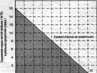 Кривая спроса на инвестиции ( ID ) строится следующим об разом : все потенциальные инвестиционные проекты распо лагаются по нисходящей в зависимости от ожидаемой нормы чистой прибыли . Кривая располагается по нисходящей , отражая обратную зависимость между реальной процентной став кой ( ценой инвестирования каждого доллара ) и совокупным объемом спроса на инвестиции .