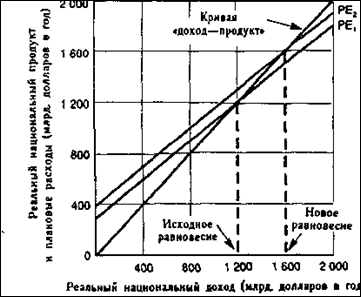 Мы убеждаемся, что смещение кривой плановых расходов на 100 млрд. долларов вызвало прирост реального национального дохода на сумму в 400 млрд. долларов. Способность абсолютного возрастания плановых расходов вызывать еще большее увеличение равновесного объема национального дохода представляет собой мультипликативный эффект