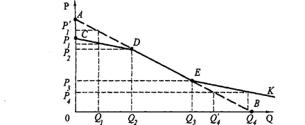 График на рис.1 демонстрирует различия в поведении предприятий в условиях монополии и монополистической конкуренции. На рис.1 линия АВ является графиком спроса при полной монополии, тогда как ломаная CDEK – кривая спроса при монополистической конкуренции.Производитель чувствует себя монополистом лишь в интервале Q 2 Q 3. Если он решит снизить объем до Q 1 , с тем чтобы цена была Р 1 ', часть покупателей уйдет к конкурентам и цена установится на уровне Р 1 . Соответственно при установлении низкой цены Р 4 производитель рассчитывает производить Q 4 ', однако его конкуренты тоже снизили цены и ему приходится увеличивать объем до Q 4.