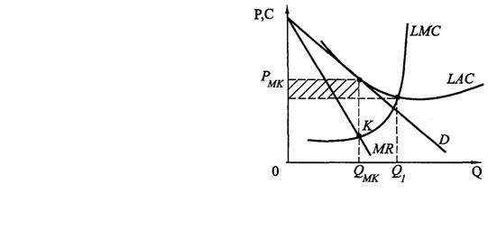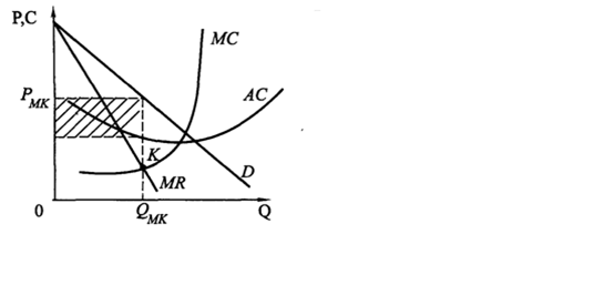 Таким образом, фирма при монополистической конкуренции в коротком периоде ведет себя как монополист, что показано на рис2. Фирма будет выпускать Q MK единиц продукции, ориентируясь на условие максимизации прибыли для монополии MC = MR , по цене спроса при данном выпуске Р MK . Заштрихованная область выше средних затрат фирмы АС является прибылью, которую будет получать фирма в коротком периоде.