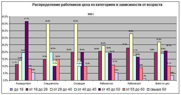 – для категории руководителей наиболее широко представлены руководители в возрасте 45-50 лет (41,7%). Более чем в два раза меньше руководителей в возрасте 40-45 лет. Немногим больше (25%) составляют руководители в возрасте от 18 до 40 лет. Таким образом, более половины руководителей находятся в возрасте старше 45 лет, при этом 5,6% - старше 60 лет. Это – направление для совершенствования структуры управления. По рабочим специальностям наблюдается достаточно ровная картина по состоянию возрастного распределения. В целом возрастной состав работников цеха однороден, в динамике изменения возрастного состава не просматриваются негативные тенденции.