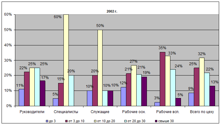 – образовательный уровень трудовых ресурсов цеха нуждается в улучшении (доля руководителей с высшим образованием не превышает 64%, а у специалистов только 45%). Среди рабочих основных специальностей произошло снижение и без того незначительного процента работников, имеющих высшее образование – с 3,5% до 1,5%. Очевидно, это явилось следствием перехода работников в категорию РСС. Такая тенденция может иметь негативные последствия в условиях научно-технического уровня производства;