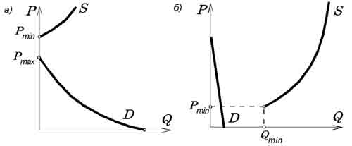 В другом случае производство благ может не требовать больших затрат, но сами блага могут быть совершенно бесполезными для потребителей. Например, производство столовых ложек без ручек стоит дешево = но кто захочет купить эти ложки даже "бесплатно"? Поэтому в данном случае, как бы дешево ни обходилось производство этих благ, кривая спроса будет либо совпадать с вертикальной осью (что практически означает ее отсутствие), либо настолько к ней "прижиматься", что никаких общих точек с кривой предложения не найдется (рис. 2. б).