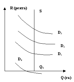 Рассмотрим ренту, получаемую владельцами земли. В целях упрощения мы будем считать, что вся имеющаяся в стране пахотная земля обладает одинаковой урожайностью и используется для производства зерна. Рынок земли совершенно конкурентен, т.е. имеется значительное количество и владельцев земли, и зерноводческих хозяйств. Поскольку суммарное количество земли фиксировано, то ее суммарное предложение абсолютно неэластично, и кривая предложения земли вертикальна (рис.1). Кривые же суммарного спроса (D1, D2, D3) имеют обычное очертание: для земли, как и любого другого ресурса, «падающий» характер кривой спроса объясняется действием закона уменьшающейся отдачи, а также тем фактом, что для зерноводческих хозяйств, как единой группы, необходимо понизить цену зерна, чтобы продать дополнительное его количество.
