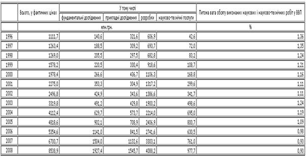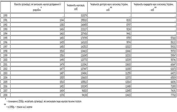 Согласно данным Государственного Комитета Статистики (см. Приложение А) численность научных работников по данным 1990-2008 гг. интенсивно уменьшается (таблица А1). Так в 1990 году данный показатель составлял 313079 человек, а по данным на 2008 – 94138 человек. Соотношение научных работников, кандидатов и докторов наук по отношению к выполненным разработкам и исследования показывает, что существует значительная «утечка мозгов». В тоже время численность докторов наук увеличивается, как и численность кандидатов наук. Рост количества исследований говорит о том, что значительно на миграцию влияют гранты, предоставляемые кадрам на территории Украины, в большей степени спонсорами из-за границы в тоже время удельный вес объема выполненных работ за каждый год периода с 1990 по 2008 уменьшался ежегодно, несмотря на увеличение разработок, научно-технических услуг и различных исследований