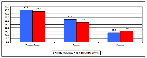 Конъюнктура мирового рынка продолжает оказывать благоприятное влияние на развитие российской внешней торговли. В январе-августе 2007 г. внешнеторговый оборот , по оценке Минэкономразвития России, составил 351,7 млрд. долларов США, увеличившись на 18,8% (в январе-августе 2006 г. – на 28,9 процента). Однако доля внешнеторгового оборота в ВВП России в последние годы снижается в результате медленной диверсификации экспорта, недостаточно сильных конкурентных позиций российских компаний. В январе-июле 2007 года в сравнении с соответствующим периодом прошлого года доля внешнеторгового оборота в ВВП несколько сократилась, рис 2.1