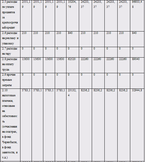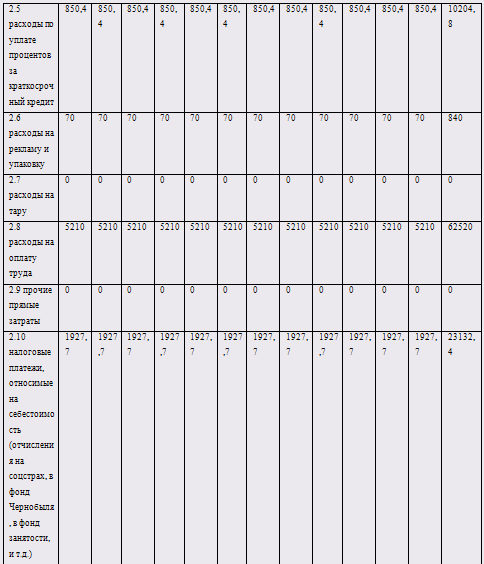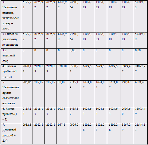Налоговые платежи, валовая и частая прибыль, денежный поток (представляющий собой сумму чистой прибыли и амортизационных отчислений). Этот расчет осуществляется на первый год в помесячном разрезе, на второй год – в поквартальном. Расчеты представлены в таблице 10.