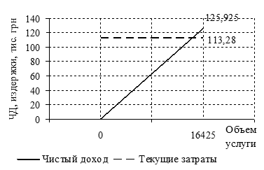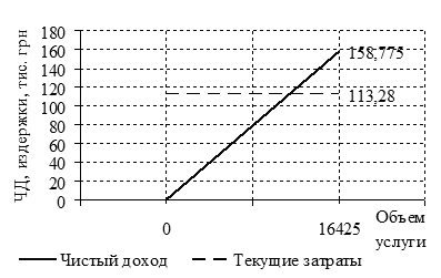 Далее определяем точку безубыточности по проекту, которая показывает, при каком объеме продажи услуги будет достигнута самоокупаемость хозяйственной деятельности объекта инвестирования на стадии его эксплуатации. Безубыточность деятельности достигается при таком объеме чистого дохода от реализации (валового дохода за минусом налога на добавленную стоимость и акцизного сбора), который равен сумме текущих затрат. Определим чистый доход при условии, что уровен цены сосавляет 8 грн. за 1 автоместо при объеме предоставляемой услуги 16425 автомест и 3 грн. за услугу прокат чехлов:
