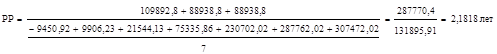На четвертом этапе рассчитываем период окупаемости инвестиций в проект. Он вычисляется как частное от деления общей суммы инвестиций на среднегодовую сумму денежного потока. Обе эти сумы должны быть приведены к настоящей стоимости по ставке процента, принимаемой в размере 10% в год (не учитываем фактор инфляции).