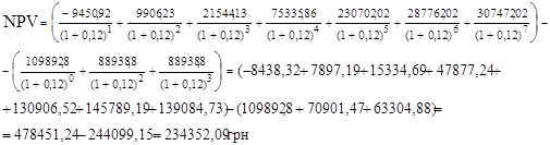 Определим чистую текущую стоимость как разницу между чистыми денежными потоками и необходимыми инвестициями с учетом, что альтернативная ставка процента составляет 12 %: