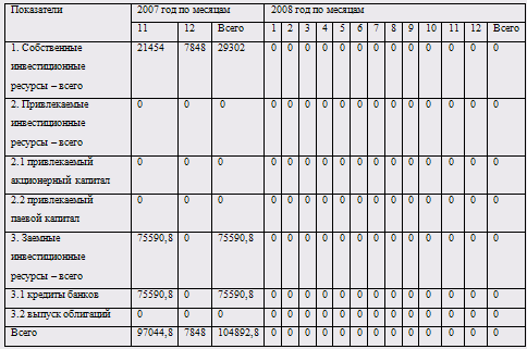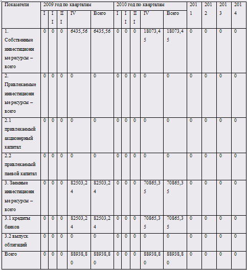 В 2009 году в четвертом квартале помимо средств на формирование резервного фонда необходимы инвестиции для строительства второй стоянки. За счет собственных средств происходит финансирование резервного фонда в размере 6000 грн. Источником инвестиции в строительство являются заемные средства – кредит в банке на 2 года под простые проценты под 13,5 % годовых, который будет погашен в четвертом квартале 2011 года. Объем кредита составляет 82938,8 грн, общий объем средств необходимых к возврату составляют 105332,28 грн