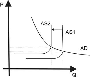 Увеличение издержек производства приводит к смещению кривой предложения влево. Это отражает увеличение издержек на единицу продукции, возрастают цены и сокращается объем реального валового национального продукта.