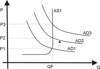Сдвиг кривой совокупного спроса вправо от AD1 К AD2 ведет к росту цен если экономика находится на промежуточном или классическом отрезке кривой совокупного предложения. Такой вид инфляции является наиболее изученным. Вычислить темп инфляции для данного года можно следующим образом: вычесть индекс цен прошедшего года из индекса последующего года, разделить эту разницу на индекс прошедшего года, а затем умножить на 100.