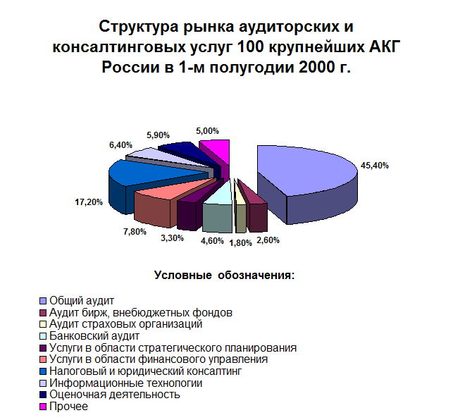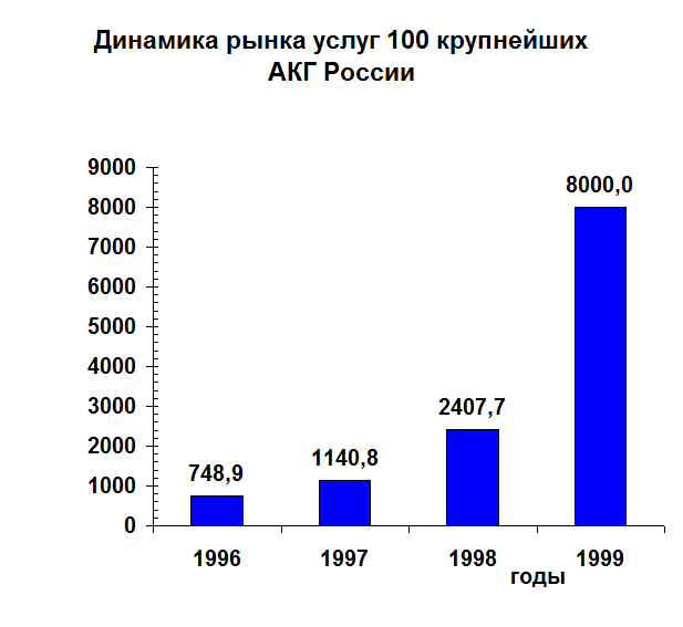 Имеющиеся данные о деятельности крупнейших отечественных аудиторско-консалтинговых фирм свидетельствуют о неуклонном росте их доходов. При этом примерно половина доходов, как уже говорилось, приходится на собственно аудит, а остальная часть – на консультации и другие аудиторские услуги. Однако только за первое полугодие 2000 года объем выручки 100 крупнейших аудиторско-консалтинговых групп (АКГ) вырос по сравнению с первым полугодием 1999 года очень скромно – всего на 27,5%. Такой прирост выручки может быть сравним с увеличением потребительских цен за тот же период (они поднялись примерно на 20%). Однако основные клиенты аудиторов не граждане, а промышленные компании, а их цены выросли на 45%. Если же принять во внимание промышленный подъем, то окажется, что предприятия в первом полугодии 2000 года увеличили свою выручку более чем на 70% по сравнению с аналогичным периодом 1999 года [42, 33].